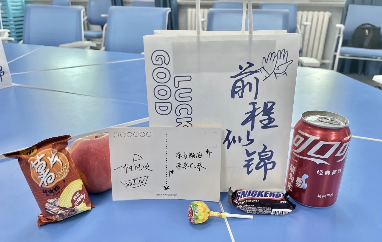 党委副书记兼副院长李超和学生工作办公室主任郝慧于管理楼206教室慰问考研学生,为他们送上一份份满含深情的考研礼物。“苹”安喜乐,“薯”你最牛,“棒”上有名,“士”气高涨,“可”期所“乐”,学院精心准备的每一份礼物,都蕴含着对考研学子的深情与厚望,寄托着美好的祝愿。其中,可乐更是特别定制,瓶身“一研为定”四个大字,成为这份礼物中亮眼而独特的存在,激励着考研学子勇往直前,奔赴梦想之约。贺卡上的手写的文字情真意切,满是对同学们的关怀与鼓励,承载着温暖的力量。李超书记和郝慧老师对学子们展现出的精神风貌给予了充分的肯定和由衷的表扬,衷心祝愿他们能在考研的战场上凯旋而归,达成自己的理想目标。